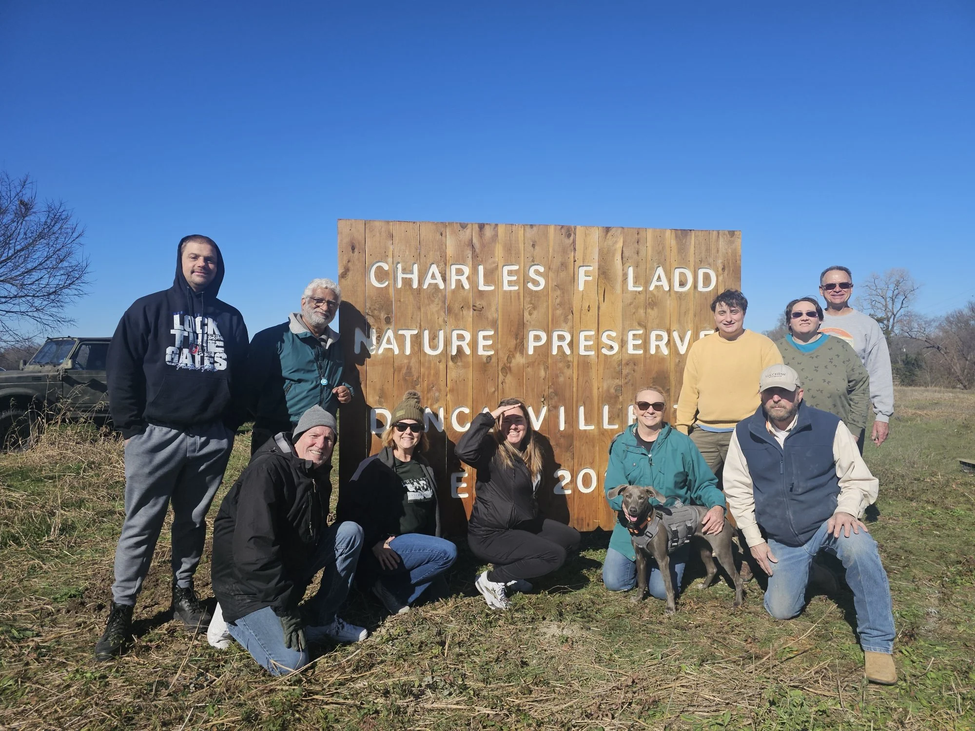 The DNC created and gifted Charles F. Ladd Nature Preserve Sign is UP January 4 2026! The Duncanville Nature Conservancy met with the Parks Commission a few weeks ago and in very positive conversations with the Board and Parks, approval was given to install the sign. The DNC freshened up the sign and prepped it for install. Bart and Jonathan at Parks orchestrated looking for underground utilities and digging the holes and members of the Nature Conservancy along with help from the Master Naturalists and Parks set the sign. Many thanks to Mark Croysdale and sons, of Lone Star Printing (and member of the DNC) for the thoughtful design and creation of this sign custom built from Oklahoma custom milled eastern cedar. And many thanks to the citizens of Duncanville and supporters of the Duncanville Nature Conservancy. The sign is at the corner of Danieldale and Cedar Hill Roads. Swing by to take a look. More great projects to come at the Ladd and in Duncanville.